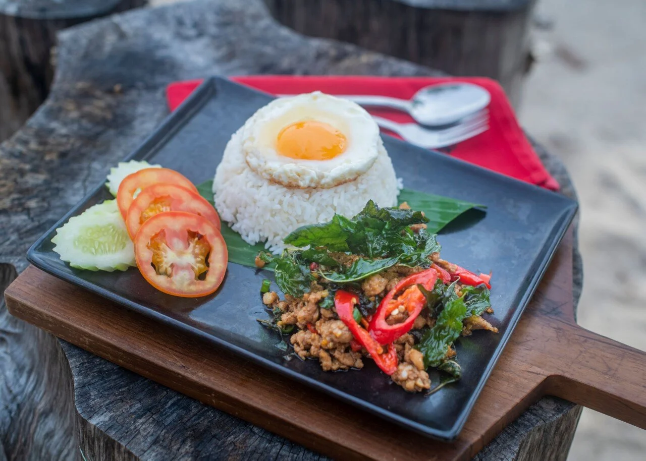 ЖАРЕННЫЙ ФАРШ КУРИЦЫ ИЛИ СВИНИНЫ СО СТРУЧКОВОЙ ФАСОЛЬЮ, ОСТРЫМ БАЗИЛИКОМ, ЧИЛИ С ЖАРЕНЫМ ЯЙЦОМ И РИСОМ