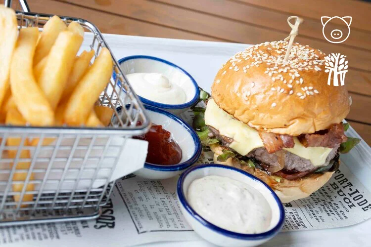 Angus Beef, Crispy Bacon, Cheddar, Onion Jam, Oven-Dried Tomato, Gherkin, Lettuce, Truffle Mayo, Potato Wedges